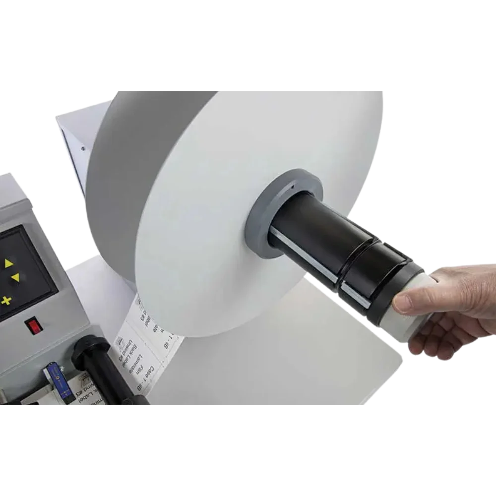 Nella funzione di riavvolgere permette di ribobinare etichette partendo da bobine di diametro massimo 300 mm avvolte internamente o esternamente, con mandrino da mm 46 a mm 110, a bobine di diametro massimo 300 mm con sbobinatura interna o esterna. La velocità media di riavvolgimento è di oltre 50 metri/minuto.
